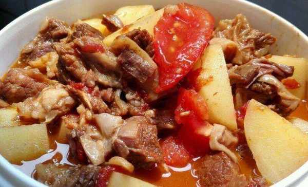 原料:牛胸肉、西红柿、土豆、料酒、葱、姜、辣椒粉、盐