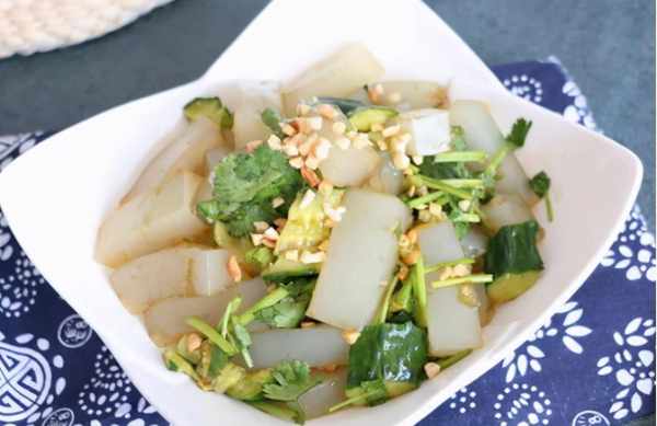 材料:黄瓜1条、凉粉1块、花生碎、香油1勺、素蚝油1勺、金兰酱油、醋