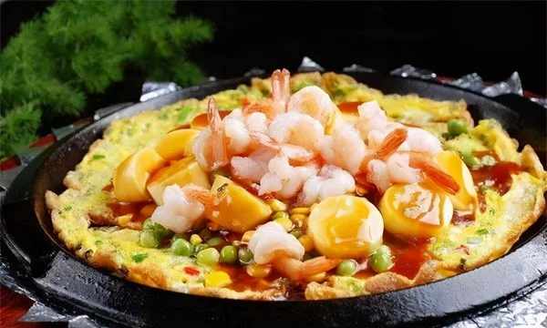 4.取铁板烧热,加入葱油,倒入蛋液加葱花和盐调味,煎成蛋饼,最后盖上熟豆腐和虾球成碗。