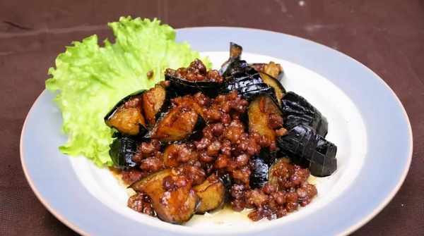 4.猪肉煮熟后,倒入炸好的茄子,然后加入糖、醋、老抽、生抽和半杯水。汤收干后,加入葱花。