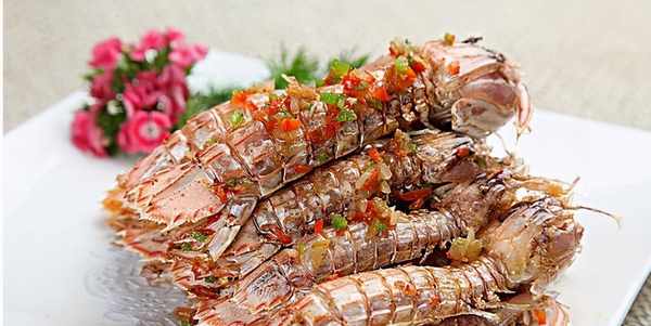 第三步就是把螳螂虾直接在锅里煎一下,然后捞出。继续加热锅,然后炸螳螂虾。