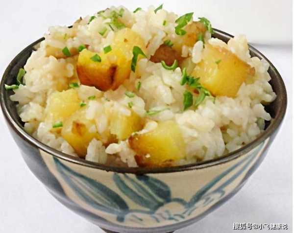 将米饭放入锅内,加水照常煮米饭,加入炸好的土豆块,蒸熟后,用筷子将米饭搅拌均匀,盖上锅盖再炖15分钟。