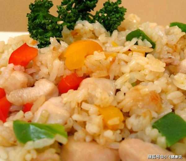 2将彩椒切丁烤熟,不断搅拌,待用;锅里放油,把洋葱末和姜末炒香,然后加入切好的咸鱼炒香,然后倒入凉米,炒至米粒松散,加入鸡丁,花椒粒,大火翻炒片刻,加入适量盐和香油。