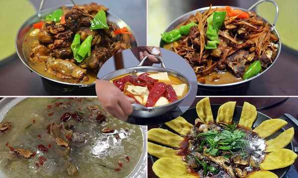 大别山物产丰富,美食更是独具特色,令人垂涎。上图分别是红烧土鸡、笋干烧排骨、老鸭汤、杂鱼锅煎玉米饼和红灯笼辣椒煮豆腐,荤菜锅子价格在120到150元之间,都是重口味,不便宜但也很实惠。