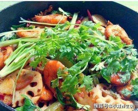 8、加入胡椒粉、盐、鸡精、孜然,加入芹菜,翻炒,翻炒,最后,煮熟后加入芝麻和葱花。非常香的干虾出炉了。