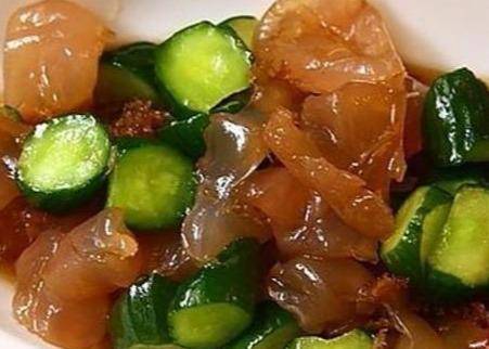 配料表:海蜇头、黄瓜、盐、糖、酱油、白醋、黑醋、糖、蒜末