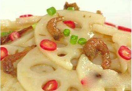 5、锅内放油,放入虾米和葱段,炒至葱段焦烂,再将春油淋在藕片上,拌匀入味。