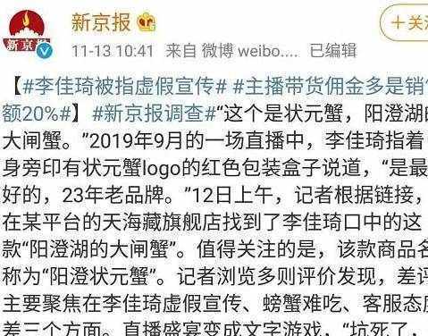 宣传的时候说是阳澄湖的大闸蟹,主播李佳琦还信誓旦旦的保证“是最好的,23年老品牌”,但是等到消费者购买后却发现,根本就不是阳澄湖大闸蟹而是洗澡蟹,可以说是被好好的坑了一大笔,好好的美食,于是成了因为主播交的智商费。