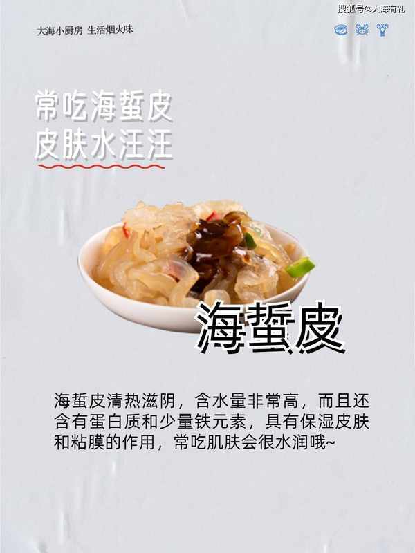 5.常吃海蜇皮 皮肤水汪汪 海蜇皮清热滋阴,含水量较高,也含有蛋白质和少量铁具有保湿皮肤和粘膜的作用。