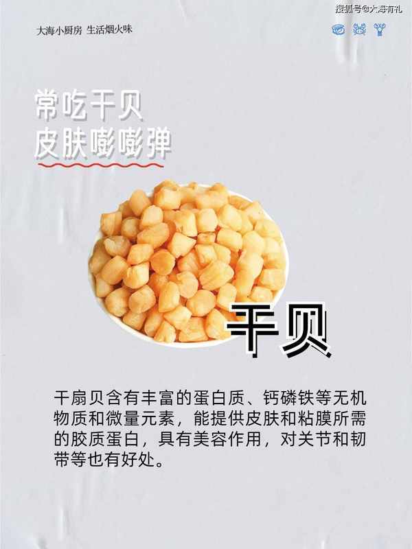 4.常吃干贝 皮肤嘭嘭弹 干扇贝含有丰富的蛋白质、钙磷铁等无机物质和微量元素,能提供皮肤和粘膜所需的胶质蛋白,具有美容作用,对关节和韧带等也有好处。