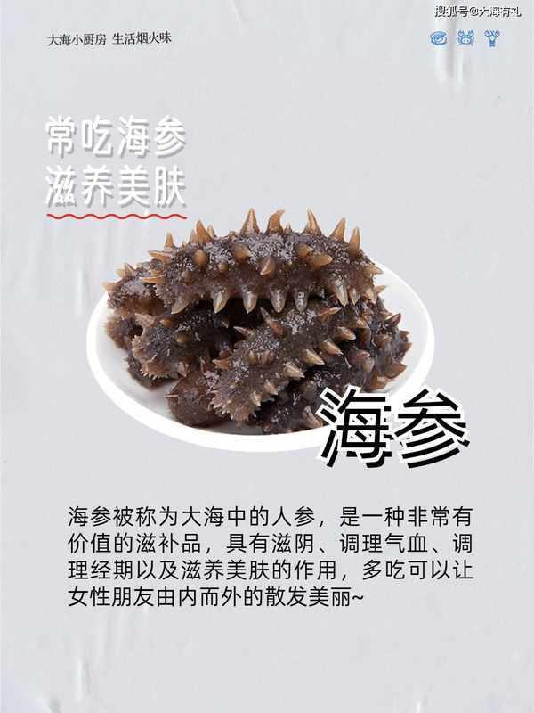 2.常吃海参 滋养美肤 海参被称为大海中的人参,是一种非常有价值的滋补品,具有滋阴、调理气血、调理经期以及滋养美肤的作用,多吃可以让女性朋友由内而外的散发美丽~