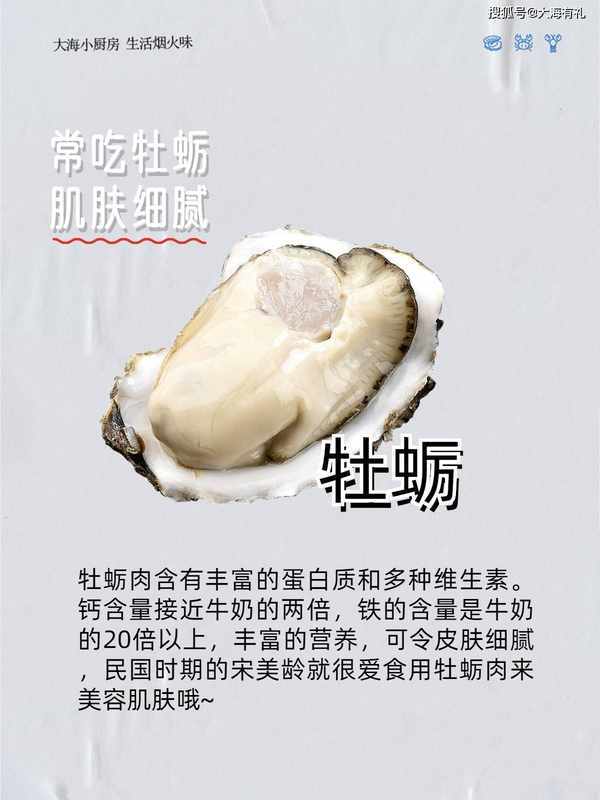 6.常吃牡蛎 细腻肌肤 牡蛎肉含有丰富的蛋白质和多种维生素。钙含量接近牛奶的两倍,铁的含量是牛奶的20倍以上,丰富的营养,可令皮肤细腻,民国时期的宋美龄就很爱食用牡蛎肉来美容肌肤哦~