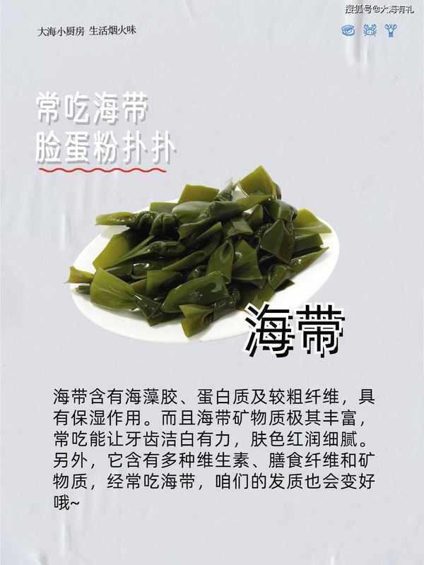 1.常吃海带 脸蛋粉扑扑 海带含有海藻胶、蛋白质及较粗纤维,具有保湿作用。而且海带矿物质极其丰富,常吃能让牙齿洁白有力,肤色红润细腻。另外,它含有多种维生素、膳食纤维和矿物质,经常吃海带,咱们的发质也会变好哦~