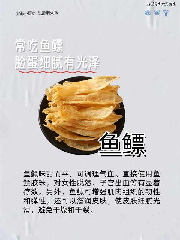 3.常吃鱼鳔 脸蛋细腻有光泽 鱼鳔味甜而平,可调理气血。直接使用鱼鳔胶珠,对女性脱落、子宫出血等有显着疗效。另外,鱼鳔可增强肌肉组织的韧性和弹性,还可以滋润皮肤,使皮肤细腻光滑,避免干燥和干裂。