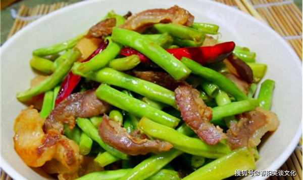 2.将切碎的蒜头放入热油锅中爆香,然后加入培根炒至半透明,捞出待用,加入豆角加少许水炒至嫩,最后加入腊肉翻炒入味,加盐和鸡精调味。