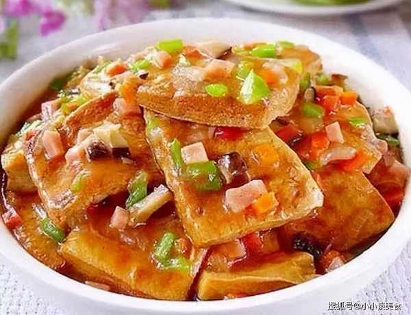 做法:1、豆腐选用北方豆腐,即老豆腐。先把豆腐切成两公分左右厚的大片,再切成大小均匀的块