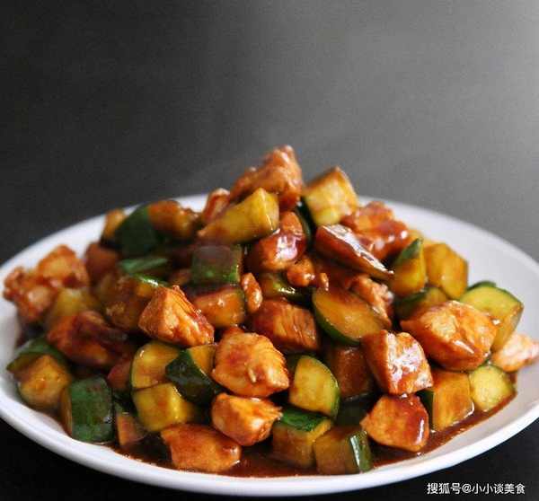5.倒入鸡丁,快炒半分钟,让酱汁均匀覆盖鸡肉,加入黄瓜丁继续炒约20秒。