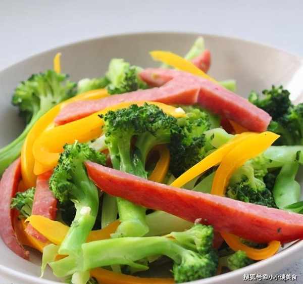 材料:西兰花1个;1个黄色甜椒;2根小红肠;一些大蒜;盐;