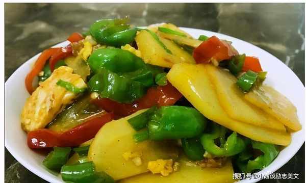 材料:鸡蛋2个、土豆1个、青椒2个、葱蒜瓣、蚝油、料酒、生抽