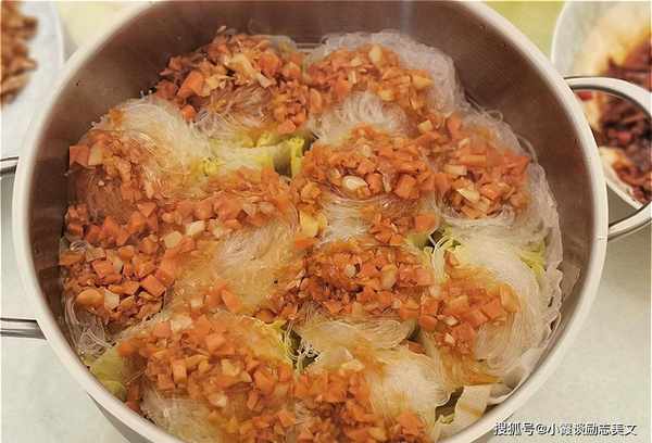 【制作步骤】青菜3个,火腿1片,粉丝一把,生抽2勺,鸡精1勺,盐3克,白糖5克,十三香少许,蒜10瓣.