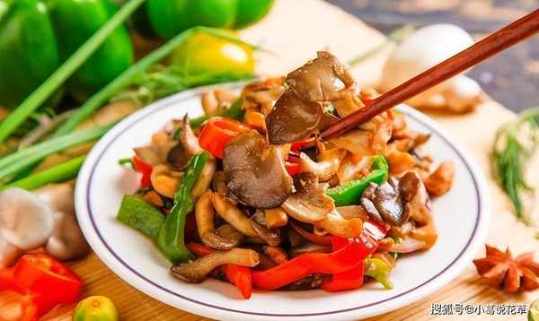 8、加入黑蘑菇,继续大火翻炒,最后倒入炸好的肉片,翻炒4、5次后装盘。