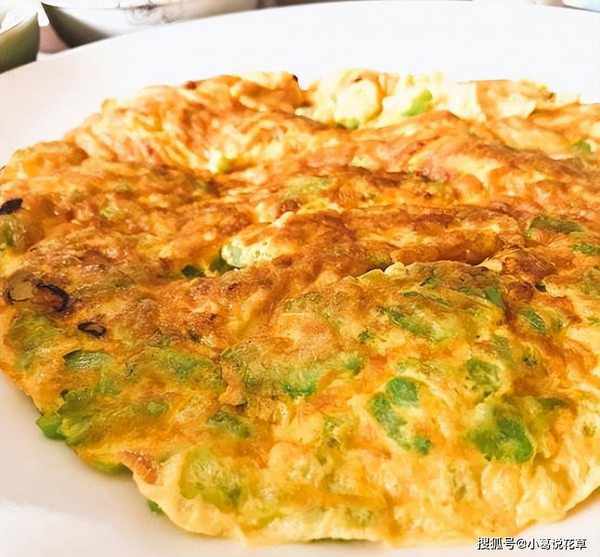5、平底锅烧热,加入植物油烧热,倒入蛋液,用筷子摊开苦瓜片。