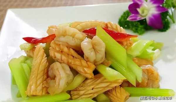 原料:鲜鱿鱼200克,芹菜100克,红灯笼椒50个,姜3片,盐2克,白糖5克,柠檬汁5毫升,料酒5毫升,香油5毫升、辣豆豉5克。