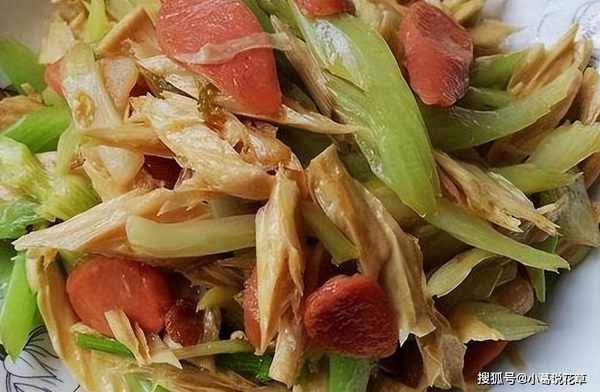 2.芹菜片,用开水焯至半透明,过冷水沥干