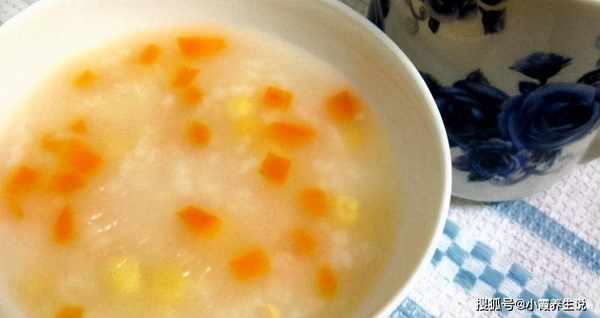 3、水开后加入胡萝卜和玉米粒边煮边搅拌。20分钟后,加入切丁的火腿,撒上切碎的小葱并撒上盐。