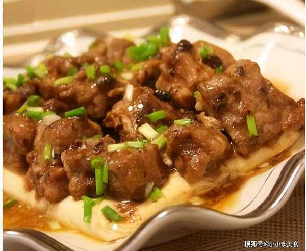 4.将陈皮、姜末、豆豉混合调味料,淋在豆腐上,蒸熟,小火蒸5分钟左右。去掉它。