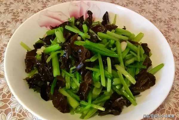 3、加入芹菜炒两分钟左右;根据需要加入盐和葱花,加入一勺生抽,炒匀。