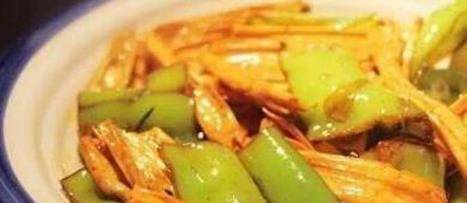 5、锅内水不多时,放入青椒爆香,出锅前加盐、鸡精调味,装盘。