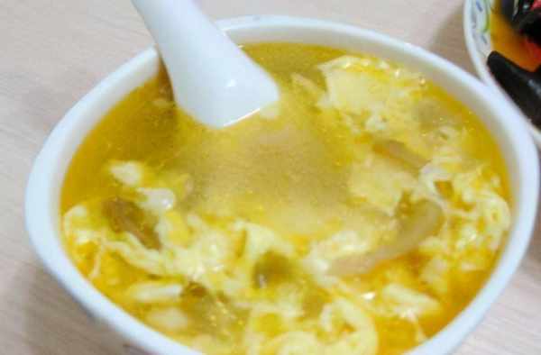 3、等锅里的水烧开后,先将面筋锅倒入锅中,用勺子搅拌,防止粘锅。锅里,汤汁清澈洁白,十分诱人。这时候把打好的蛋液慢慢倒入锅里,形成蛋花!