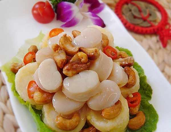 材料:干贝12个、日本豆腐4条、生菜1条、腰果50克、红辣椒1个、鸡蛋1个、生粉适量、生姜1片、料酒1茶匙、盐、糖、胡椒粉各1/3茶匙
