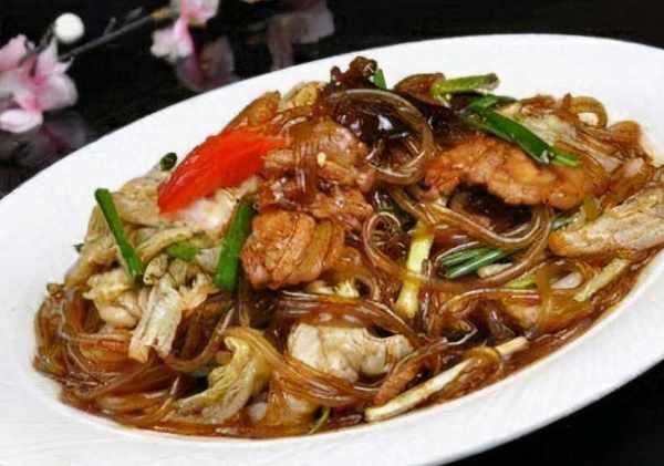 2、煎锅加入适量油,烧热。加入辣椒、葱花、姜片、五花肉炒香。加入白菜、盐、酱油和料酒,搅拌至熟,然后加入粉丝、味精和醋。炒几次,撒上香菜。