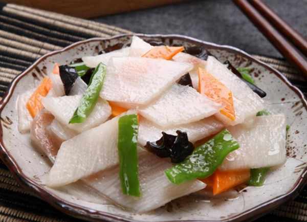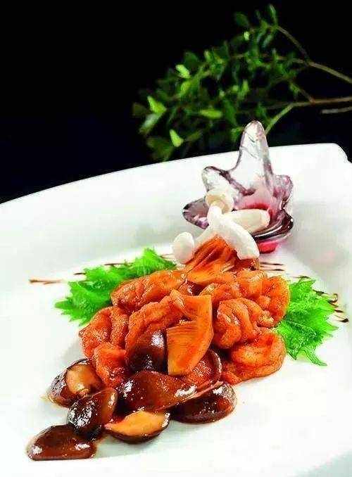 2、锅内放20克菜籽油,倒入50克预先煮熟的鱼筋、春笋、香菇,倒入15克蚝油、150克鸡汤煮熟大火煮沸。用2克盐和5克糖调味。倒入5克湿淀粉勾芡,出锅前倒入5克苹果油