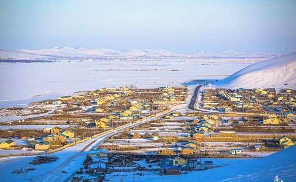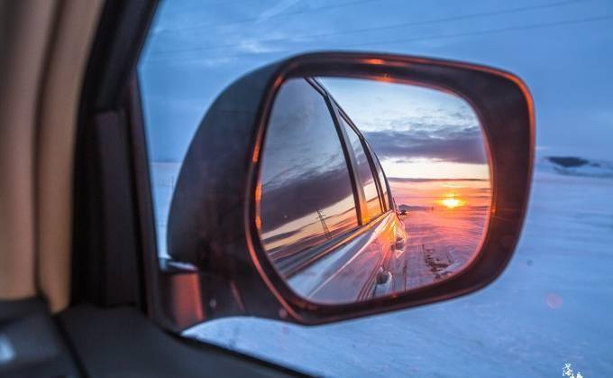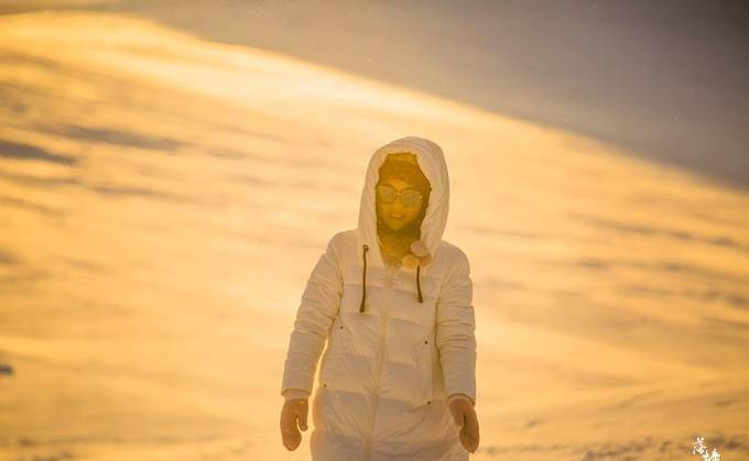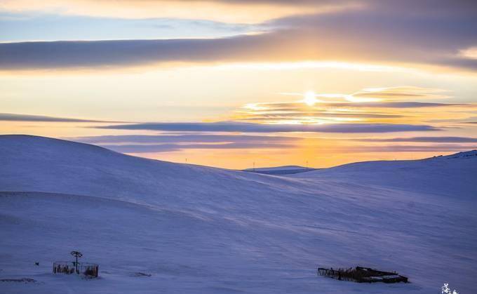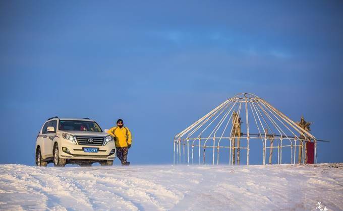 零下30度的气温,车子飞驰在广袤的雪域草原上,夕阳渐渐远去。