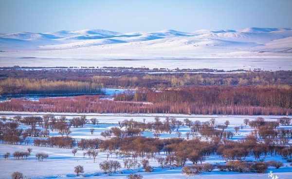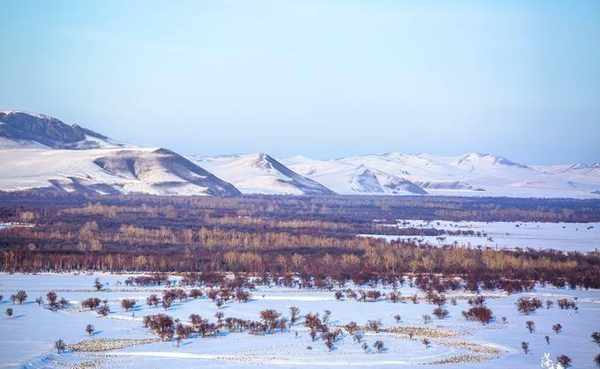冬天的大草原,花叶被打得粉碎,远处的天空,白雪皑皑,一望无际的群山……一树一字一山一画,共同谱写了草原的童话冬天。