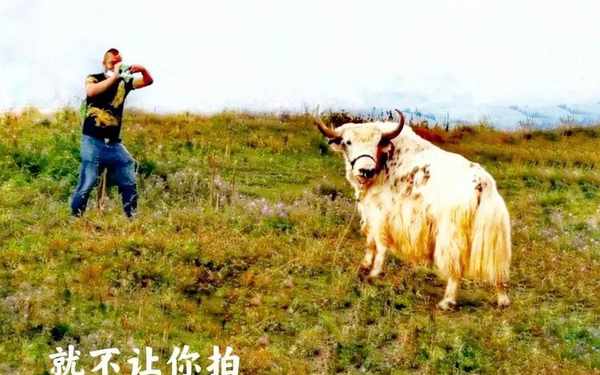 一个男游客端着手机,离它很近,跟着它转圈圈,嘴里嘀嘀咕咕地发出各种奇怪的声音,想吸引牦牛回头看他。