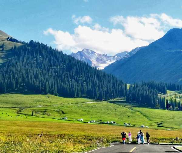 路边的草地上不时闪过吃草的牛羊,哈萨克族雪白的毡房在绿草如茵的草原上特别醒目!好一幅恬静的人间天堂的温馨画面,看了让人心里暖暖的。