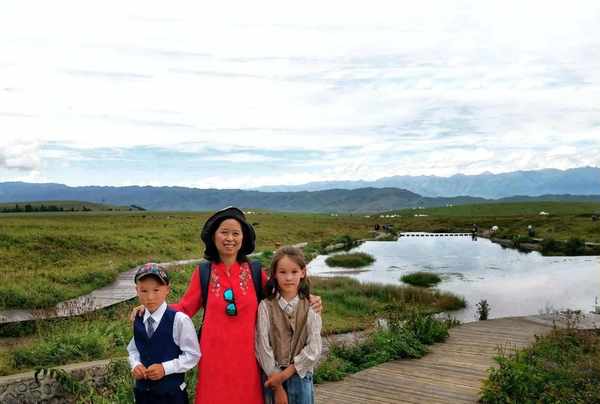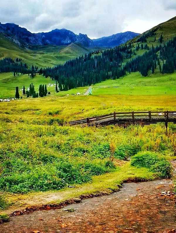 这里有雪山、草地、小溪,有高耸入云的墨绿色林木,有悠闲的牛羊,有白色的毡房星星点点,那是真正生活在这里的牧民的家,还有可爱的孩子们,在河边嬉戏玩耍,奔跑着。