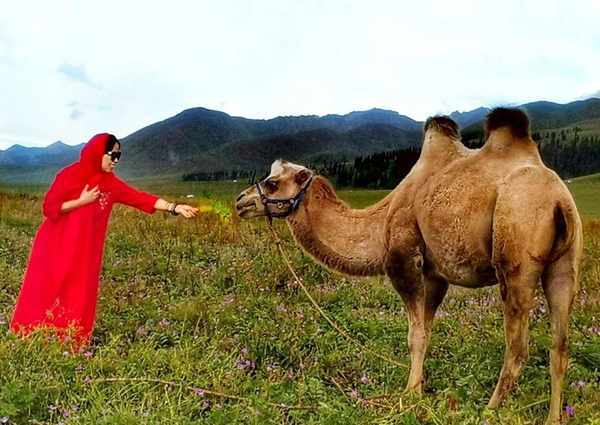 开始我有点儿紧张,不敢离它太近,再小的骆驼也很高大呀,怕它踢我或者咬我,可是小骆驼看到我向它举起青草,明白了我的意思,低下头吃起了我手里的青草,