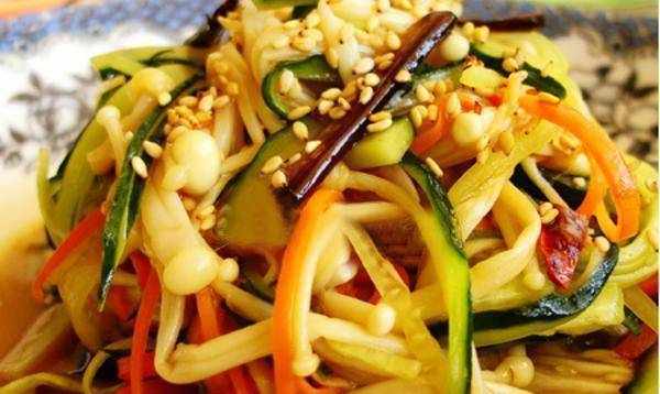材料:金针菇、胡萝卜、黄瓜、大葱、芝麻、生抽、熟醋、盐、蜂蜜