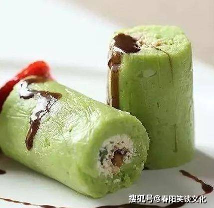 3、保鲜膜上铺好拌好的泥,包上老豆腐馅,上面撒上腰果碎,卷起来,切块装盘摆盘。