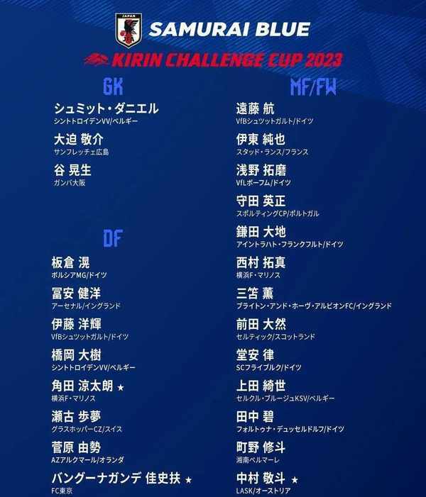 北京时间3月15日,森保一公布了最新一期国外队名单。在所有26名队员中,参加过卡塔尔世界杯的共有16人。包括吉田麻也、酒井宏树、长友佑都、权田修一、柴崎岳在内的多名老将均被排除在外,取而代之的是濑古步梦、菅原由势为首的大批年轻队员。其中横滨水手的角田凉太朗、大阪钢巴的半田陆、东京FC的佳史扶、林茨的中村敬斗四人首次入选。