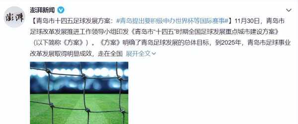 那么如今国内真的有一个地方发布了最新的足球发展建设方案,其中就重点提到了申办世界杯,这个地方就是山东青岛,他们首次在正式的文件里面明确表明了要积极申办世界杯,青岛市足球变化发展推进工作领导小组,印发的《青岛市“十四五”时期全国足球发展重点城市建设方案》中,明确写到了青岛足球发展的总体目标,除了要力争实现职业足球和群众足球以及青训足球、校园足球的全方面结合之外,这个方案里还重点提到了一句球迷们极其感兴趣的话:“青岛要积极申办世界杯,世界杯等重大国际赛事和我们足协系列赛事!”这应该是迄今为止第一份在官方文件里面出现了要积极申办世界杯等重大赛事的字样,看来我们申办世界杯真的早就提上了议程了