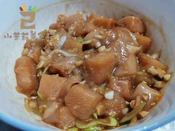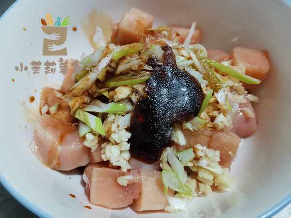 1、准备一块鸡胸肉,最好现买现吃,先用温水冲洗干净,接着把残留的水分擦干,切成2公分左右大小的块状。准备一些蒜蓉葱花放进去,接着淋入生抽,蚝油,白胡椒,一点盐,然后抓拌均匀。