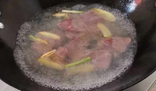 3、起锅烧油,放葱姜炝锅,把猪肝丢进去快炒至变色,接着倒入热开水适量煮沸。
