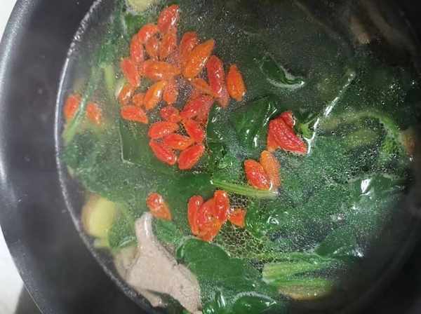 4、煮一两分钟粥,把菠菜放到锅里,同时放一把枸杞,调入少许盐,就可以出锅享用了。