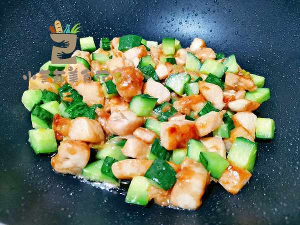 5、鸡肉炒出焦香味后,把黄瓜倒进去,这时候可以再调入一点生抽,少许盐,快炒几下,就可以关火装盘了。